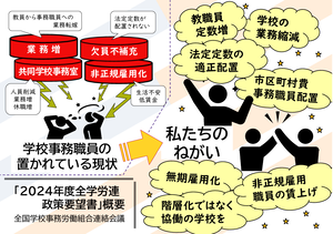 ▽「チーム学校」「働き方改革」「質の高い教師の確保」といった政策における、教員から学校事務職員への業務転嫁に反対します。教職員定数の改善や学校が負う業務・役割そのものの縮減といった、抜本的かつ具体的な施策を求めます。