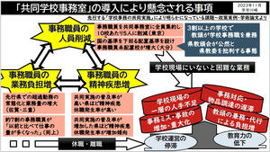 川崎市教委当局が導入を検討している「共同学校事務室」。学労川崎はこれについて、事務部門集約による学校事務職員の人員削減や業務負担増をもたらすとともに、学校現場における一層の人手不足や業務遅滞を招き、学校運営にもマイナスをもたらすものと批判してきました。これらは何も根拠なく述べているものではありません。共同学校事務室の前身政策である「学校事務の共同実施」については、政策実例や学術論文が積み重ねられていますが、それらの中で現実に明らかになっている問題です。